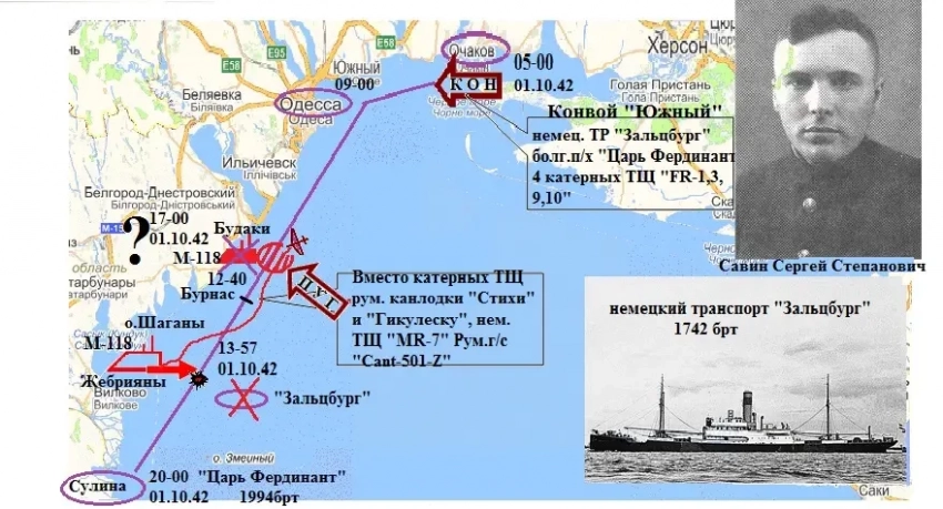 1 октября 1942 года у северо-западного побережья Чёрного моря подводная лодка М-118 под командованием капитан-лейтенанта С.С. Савина потопила немецкий транспорт «Зальцбург» (“Salzburg”), на борту которого находилось 2300 советских военнопленных.