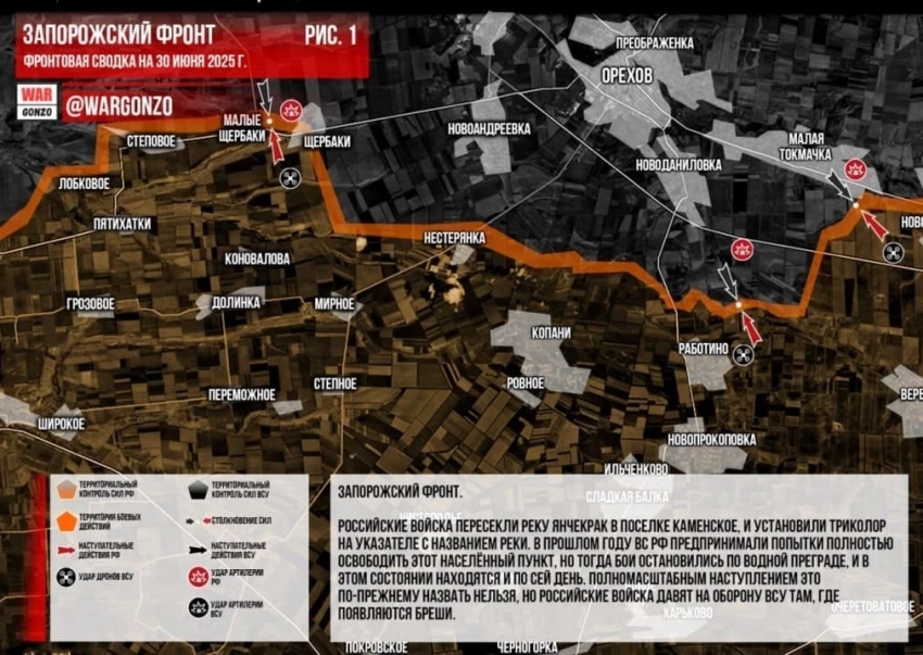 На Запорожском направлении российские войска пересекли реку Янчекрак в поселке Каменское, и установили триколор на указателе с названием реки. В прошлом году ВС РФ предпринимали попытки полностью освободить этот населённый пункт, но тогда бои остановились по водной преграде, и в этом состоянии находятся и по сей день. Полномасштабным наступлением это по-прежнему назвать нельзя, но российские войска давят на оборону ВСУ там, где появляются бреши. Также, есть продвижения на Гуляйпольском направлении, где по сообщениям нескольких источников ВС РФ продвинулись к центральной части Малиновки, сообщает Telegram-канал Wargonzo.