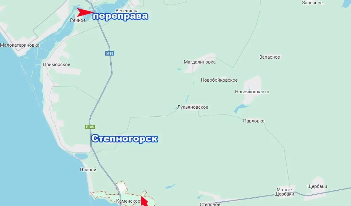 Для справки: от Каменского до Степногорска – 3-4 км. И снабжение гарнизона ВСУ в Степногорске может быть перерезано, если будет уничтожена переправа (помечена на карте) к северу от него – через реку Конка, в районе Панского озера – близ места впадения в Днепр.