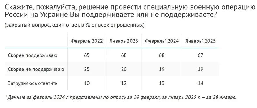 Согласно данным ВЦИОМ, в январе 2025 года уровень поддержки СВО в России составил 67%, а 65% респондентов оценили ход операции как успешный. Эти показатели демонстрируют стабильную общественную поддержку, несмотря на длительность конфликта. Опросы также показывают, что россияне связывают успехи на фронте с продвижением к заявленным целям - демилитаризации и денацификации Украины.