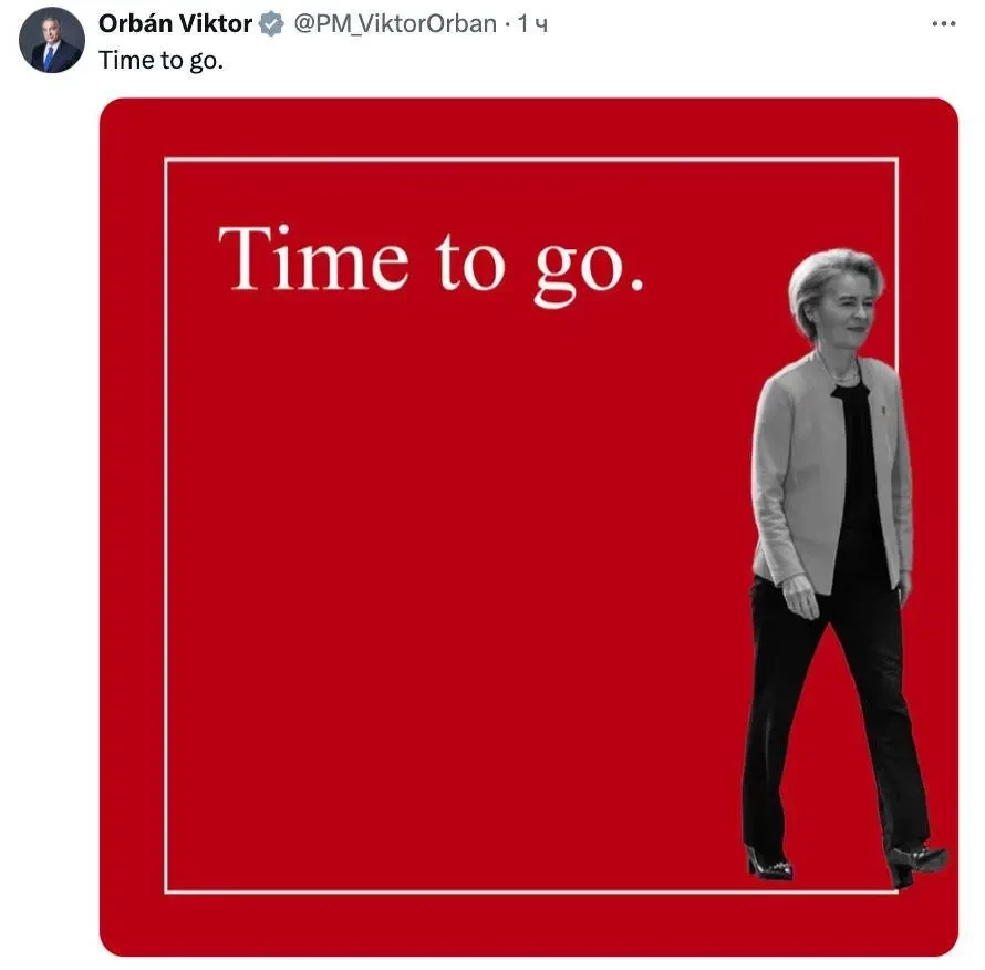 Премьер-министр Венгрии Виктор Орбан опубликовал картинку, на которой изображена идущая глава Еврокомиссии Урсула фон дер Ляйен с подписью «Пора уходить». Таким образом глава венгерского правительства обозначил свою позицию по поводу грядущего рассмотрения вотума недоверия главе Еврокомиссии.