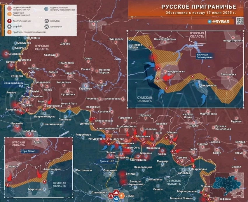 В Сумском приграничье у Демидовки и Поповки пока затишье: враг не отступает, но и активно не наступает, преимущественно работает дронами. Российские штурмовые группы вошли в Рыжевку. ВСУ провели до десятка контратак на линии Кондратовка - Андреевка - Алексеевка - Варачино. Противник отброшен, однако тяжело пришлось в Кондратовке, где нашим бойцам всё же удалось оттеснить ВСУ из центра села. Восточнее по фронту есть успехи в Юнаковке, большая часть которой под контролем армии России. Продолжается штурм Мирополья: противник теперь в низине и просматривается как на ладони.