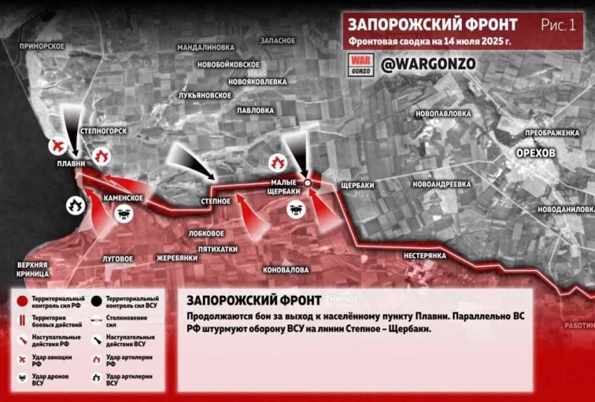 На Запорожском направлении продолжаются бои за выход к населённому пункту Плавни. Параллельно ВС РФ штурмуют оборону ВСУ на линии Степное - Щербаки.