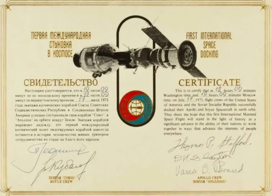Свидетельство о первой международной стыковке в космосе, подписанное всеми участниками полета «Союз-Аполлон»