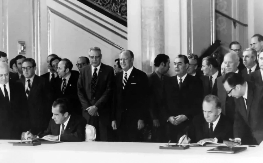 Президент США Ричард Никсон (сидит слева) и председатель Совета министров СССР Алексей Косыгин (сидит справа) подписывают соглашение, предусматривающее полет по программе «Союз-Аполлон», 24 мая 1972 года