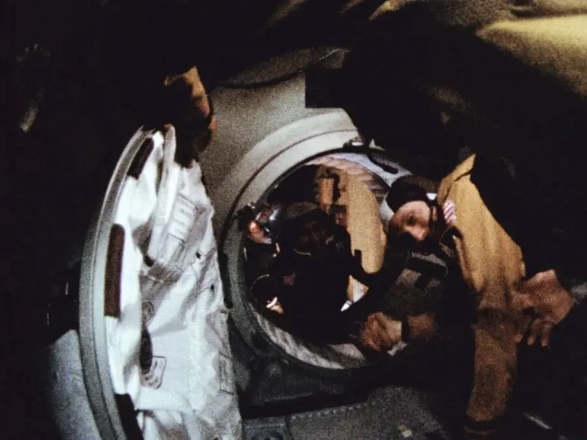 Первое советско-американское рукопожатие в космосе. Справа — выходящий из переходного отсека Томас Стаффорд, слева — встречающий его на борту «Союза-19» Алексей Леонов. Кадр из прямой телепередачи с орбиты, 17 июля 1975 года