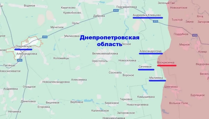 Российские войска, освободив село Воскресенка, продолжают наступательные действия на западе ДНР. Продвигаясь западнее указанного села, подразделения армии России вышли ещё на одном участке к границе Днепропетровской области, которая (граница) с 2022 года является государственной. Поступают сообщения о том, что граница эта пересечена, и ВС РФ двигаются в направлении днепропетровских сёл Сичневое и Малиевка.