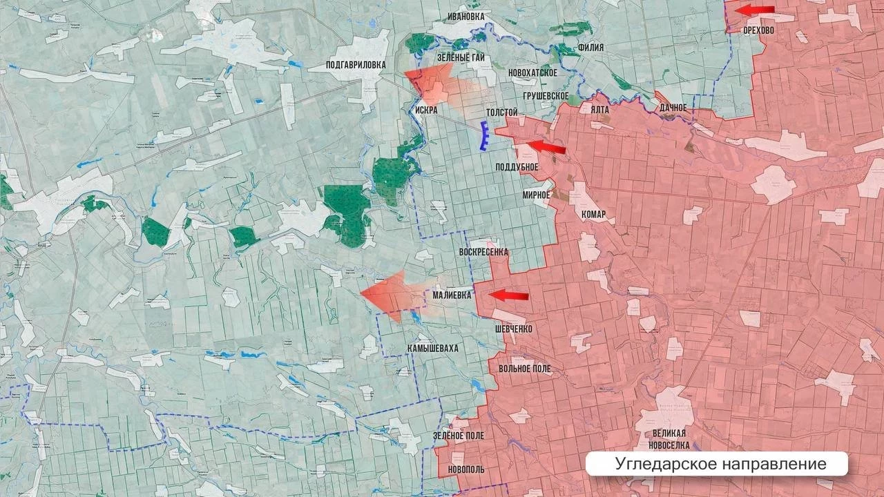 На Угледарском направлении севернее Зелёного Поля наши бойцы вклиниваются в оборону ВСУ в направлении Камышевахи и установили контроль на участке до 1 км в глубину и более 2,5 км по фронту. Есть успехи к востоку от Темировки, в районе Малиевки, Январского и Поддубного. Севернее ВС РФ закрепляются в восточной части Зелёного Гая, а также пытаются охватить район Искры для выхода к Подгавриловке. По данным с мест, ночью из этого района дезертировало подразделение ВСУ.