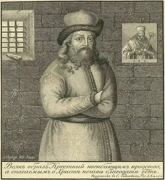 Арсений Мацеевич в темнице. Гравюра Л. Серякова (с более ранней гравюры А. Осипова, созданной по портрету работы А. Ковалькова)