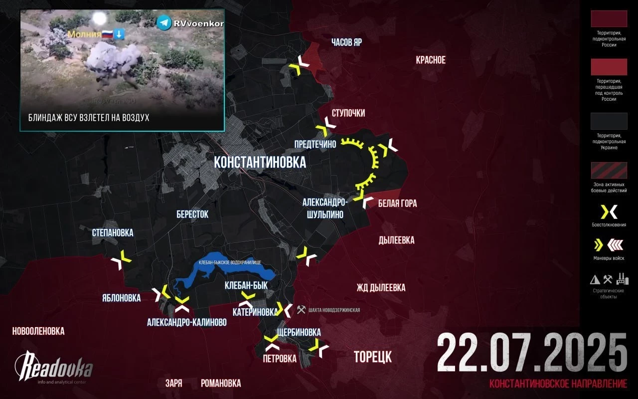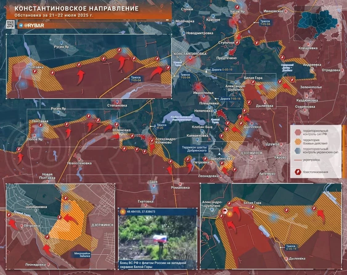 На западном участке Константиновского направления ВС РФ взяли под контроль почти всю западную часть Полтавки, сражаются на юге села. Идут бои за высоты в районе восточной окраины Русин Яра. Наши продвигаются по трассе между Степановкой и Яблоновкой на Бересток. Это продвижение, а также успехи наших войск в южной части Щербиновки, создают угрозу оперативного окружения ВСУ на Клебанбыкском участке. На восточном фасе, опираясь на село Белая Гора, наши штурмуют Александро-Шультино, а также пробиваются на север навстречу подразделениям из района Предтечино. Как только наши войска встретятся, группировка ВСУ, удерживающая правый берег канала Северский Донец – Донбасс, окажется в «котле».