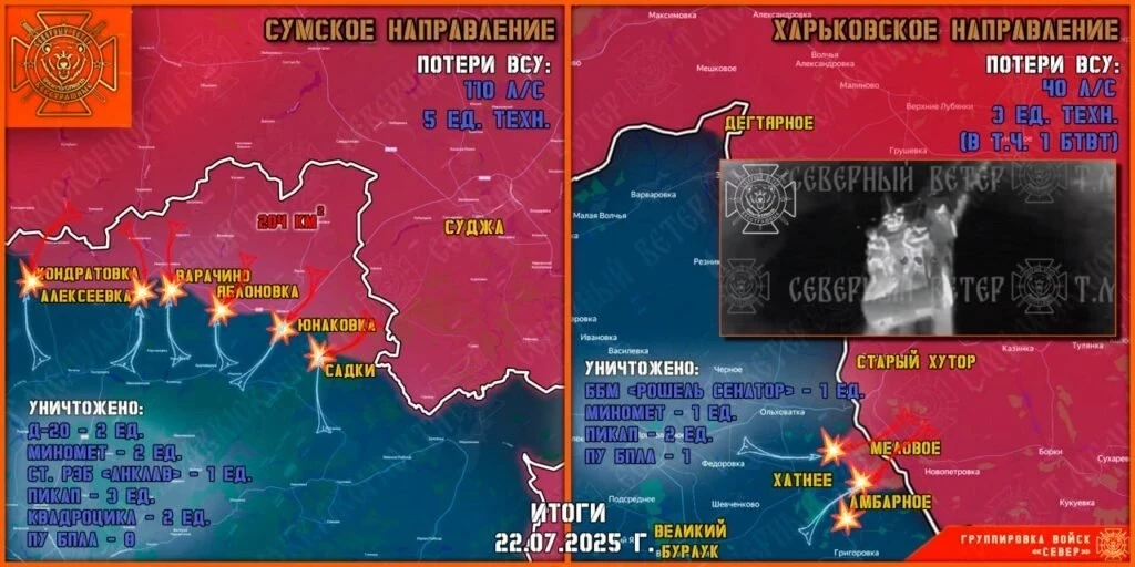 Не прекращаются ожесточенные бои в районе Кондратовки. Командование ВСУ продолжает отправлять на убой штурмовые группы 225 ошп, доукомплектованного для захвата этого небольшого села военнослужащими других подразделений. Северяне перемалывают живую силу противника и продолжают наступление на «Сумском фронте». Наши десантники и мотострелки завершают зачистку Варачино, выбив врага из пяти домовладений на южной окраине села.