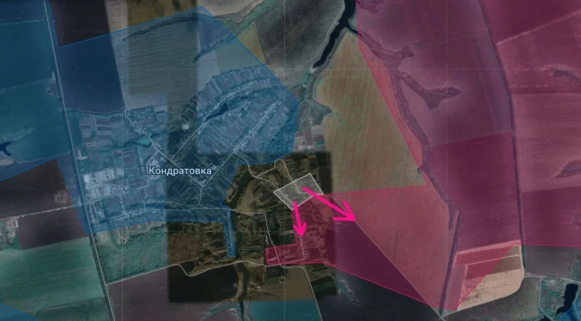 В Сумской области идут тяжёлые бои. В Кондратовке российские войска, применяя ФАБы, заняли большую часть села, украинские войска пытаются контратаковать и вернуть контроль, в том числе и севернее Андреевки.