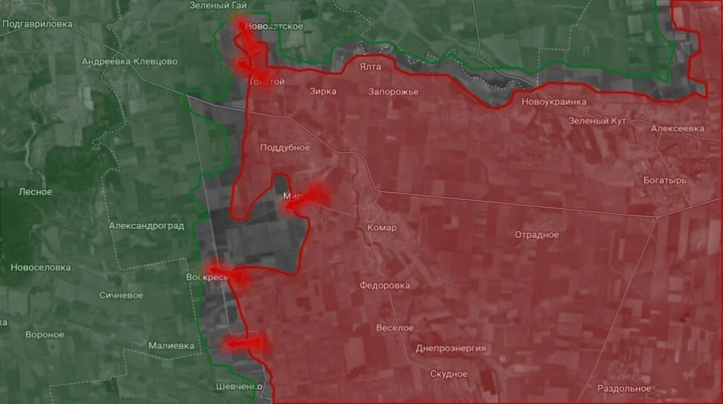В районе Зелёного Гая идут интенсивные позиционные бои, в основном на окраинах и в лесополосах. Подразделения ВС РФ стремятся охватить фланги противника, создавая угрозу для украинских позиций в этой зоне. Эти боевые действия могут стать важным шагом в дальнейшем продвижении российских сил вглубь территории.