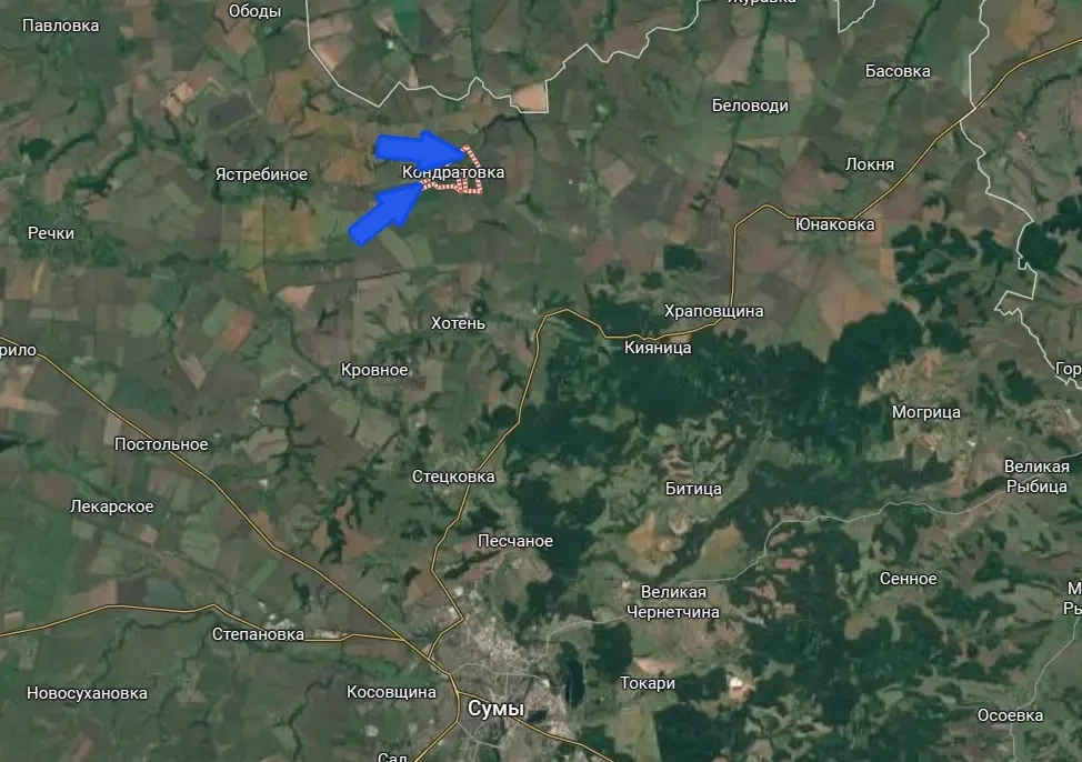Сумская Кондратовка превратилась в один из самых сложных локальных участков фронта. Поступает информация о том, что противник, проведя ряд фланговых маневров малыми группами, смог осуществить охват населённого пункта. В такой ситуации наши подразделения, находившиеся в Кондратовке и окрестностях, не смогли оперативно отойти на другие позиции, продолжив держать оборону в населённом пункте.