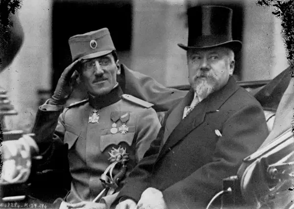 Тогда еще принц-регент Александр I и Президент Франции Раймонд Пуанкаре. В 1916 году сербский принц-регент Александр I и президент Франции Раймон Пуанкаре посетили Верденский фронт. Этот визит был направлен на укрепление морального духа и демонстрацию солидарности между Сербией и Францией. Александр I был принцем-регентом Сербии и действовал от имени своего больного отца, короля Петра I. Он занимал пост Верховного главнокомандующего сербской армией во время Первой мировой войны