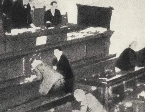 Пуниш Рачич стреляет в члена парламента, 20 июня 1928 года сербский депутат из Черногории Пуриша Рачич открыл огонь по депутатам-хорватам в здании югославского парламента, сидевших на первых скамьях. Сразу же после расстрела хорватских депутатов югославский парламентаризм рухнул, уступив место открытой диктатуре принца-регента Александра