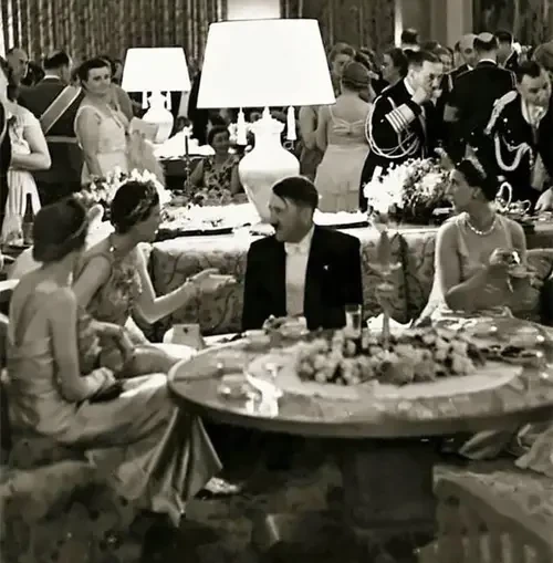 Принцесса Ольга Карагеоргиевич, жена принца-регента Павла, беседует на светском приеме с Адольфом Гитлером. Эта фотография была сделана в июне 1939 года во время официального визита принца Павла в Берлин, когда правящий монарх, король Петр II, был еще совсем несовершеннолетним. Это была очередная попытка склонить Югославию на сторону стран Оси, от которой Павел успешно воздерживался с 1934 года (пока ситуация не стала невыносимой в апреле 1941 года)