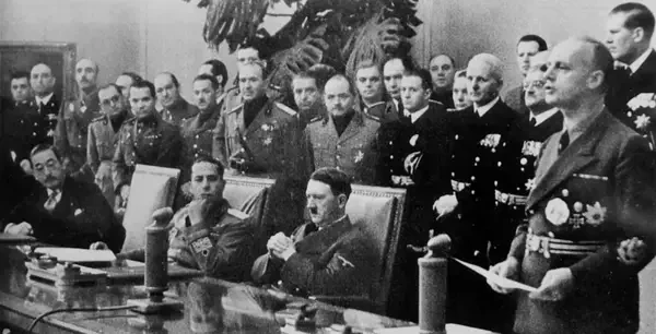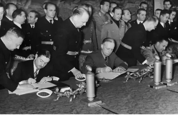 Министр иностранных дел Германии Иоахим фон Риббентроп произносит речь после подписания Тройственного пакта. Соглашение было достигнуто после нескольких месяцев переговоров между Германией и Югославией министром иностранных дел Германии Иоахимом фон Риббентропом и премьер-министром Югославии Драгишей Цветковичем. Согласно этому договору, страны Оси обязуются уважать суверенитет и территориальную целостность Югославии