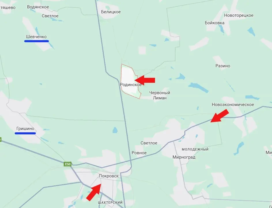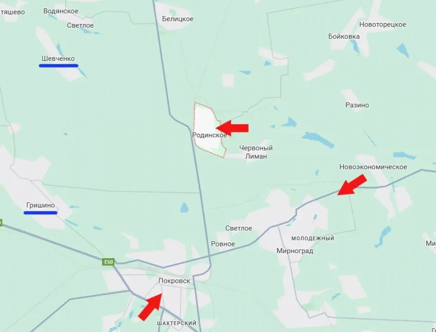 От Родинского до Гришино, которое является ключом к западному маршруту снабжения Покровского гарнизона ВСУ, около 8 км. И того меньше до упомянутого Шевченко.
