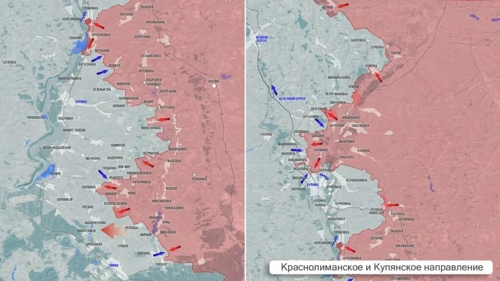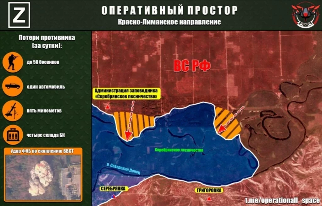 На Константиновском фронте в районе Полтавки – Русин Яра идут позиционные бои. Южнее Клебан-Быкского водохранилища ВС РФ начали зачищать образовавшийся карман. В районе Катериновки и Клебан-Быка идут бои, сёла находятся в серой зоне. Севернее Торецка сообщают об успехах в Александро-Шультино. По неподтверждённым данным, ВС РФ закрепились в Предтечино и вытесняют оттуда противника. Наши штурмовики развивают наступление из Часов Яра в сторону Дружковки. Есть тактические успехи в районе канала Северский Донец-Донбасс у Григоровки.