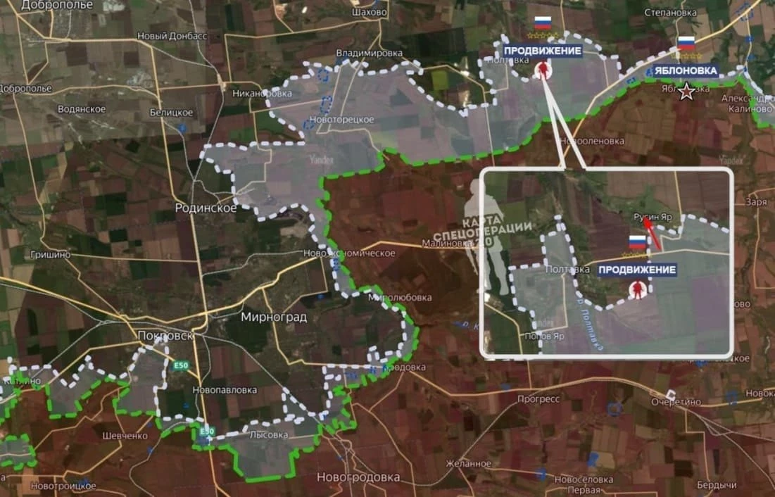 На Константиновском фронте ВС РФ продвигаются севернее Полтавки, а восточнее, по оперативным данным, освобождён Русин Яр. По данным Минобороны, освобождена Яблоновка – село у трассы, соединяющей Покровск с Константиновкой, в 10 км к юго-западу от последней. Таким образом, левый фланг группировки ВС РФ на этом участке вышел к водохранилищу Клебан-Бык. На правом фланге наши военные развивают наступление к Катериновке-Клебан Быку-Плещеевке, прижимая подразделения ВСУ к правой окраине водохранилища. Группировка ВСУ, запертая в районе южнее водохранилища, под угрозой полного окружения. Южнее, в Щербиновке, наши продвигаются как с севера, так и с запада. Выше по фронту армия России закрепилась на южных окраинах Александро-Шультино. По самой Константиновке наши отработали авиабомбами ФАБ-3000.