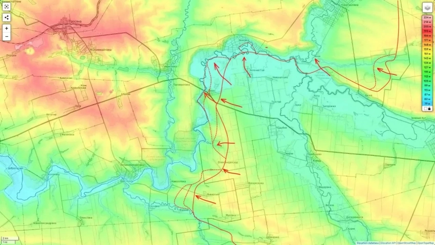 На опубликованной карте видно, что российские войска продвигаются с северо-востока к Васильевке, откуда могут повернуть на юг к Гришино и полностью перерезать трассу Днепропетровск - Красноармейск.