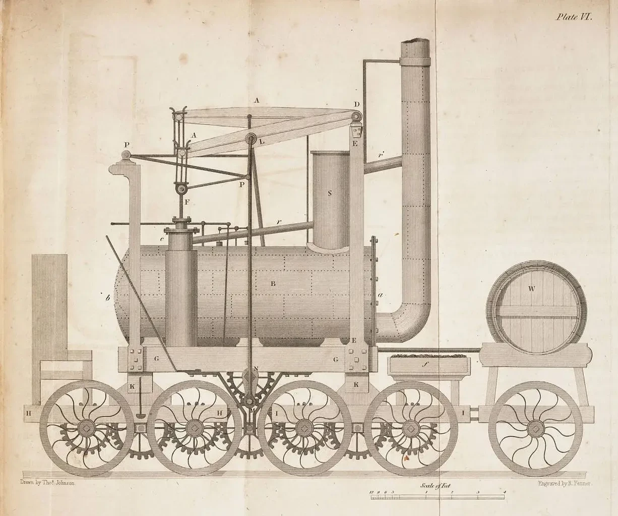 Ну а Бленкиншоп решил сделать железную дорогу с зубчатым ведущим рельсом, который для неё изготовил механик Мэтью Мюррей. Зубчатое ведущее колесо катилось по гребёнке, закреплённой сбоку от рельсов. Миддлтонская машина проработала четыре года без перерыва и при этом перегоняла до 30 вагонеток с углем с небольшой скоростью 5 км/ч. А всего было построено четыре таких паровика, на одном из которых взорвался паровой котел из-за неумелой работы машиниста с его предохранительным клапаном.