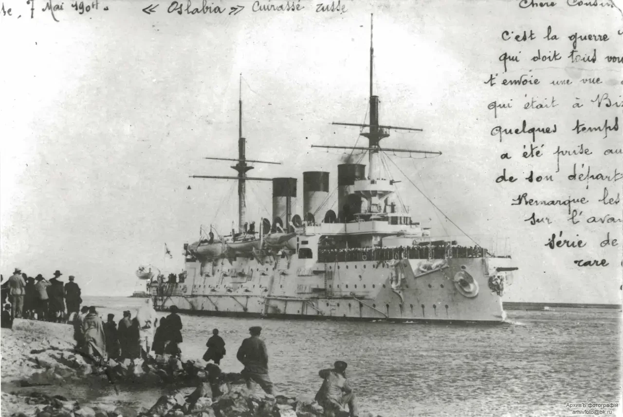Очевидно, это выражение означает наличие у «Осляби» такого дифферента, при котором нижняя кромка клюзов приблизилась к воде. Согласно фотографиям и схемам «Осляби», хорошо видно, что эта кромка клюзов располагалась от силы в нескольких десятках сантиметров над батарейной палубой эскадренного броненосца. Обратимся хотя бы к фото, выбранному мною для заставки данной статьи.