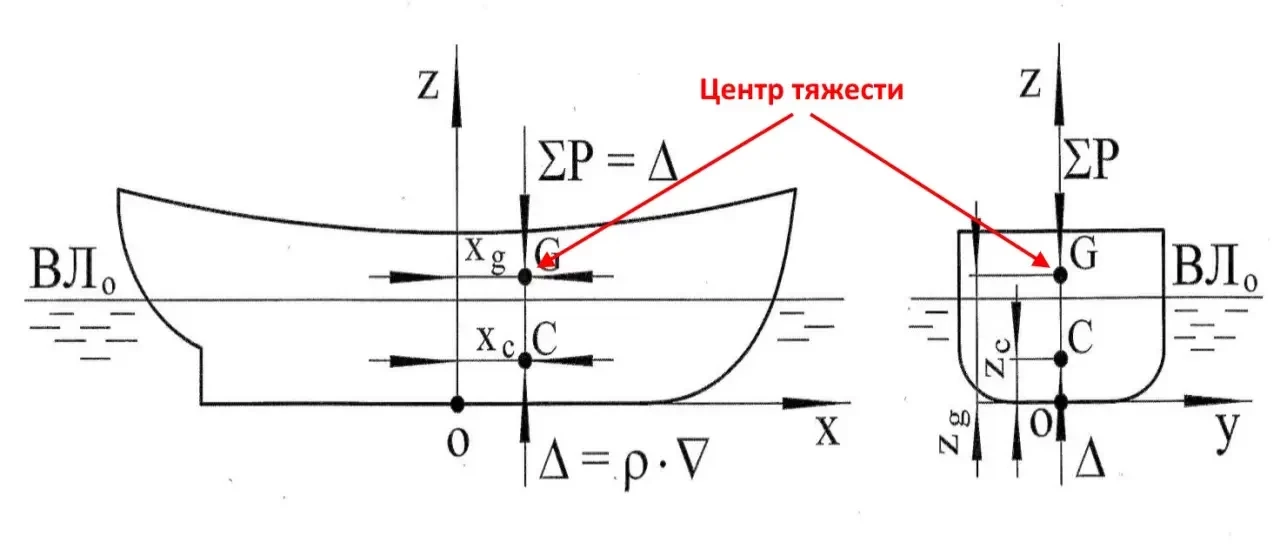 Как вообще возникает крен и дифферент? У любого корабля есть точка, именуемая центром тяжести. Обычно центр тяжести расположен в диаметральной плоскости, чуть вперед от мидель-шпангоута.