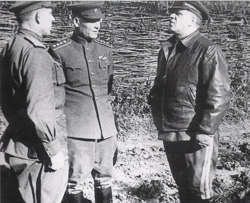 Маршал Г.К. Жуков (справа) совещается с командующим войсками Степного фронта генералом армии И.С. Коневым (в центре) и командующим 53-й армией И.М. Манагаровым накануне форсирования Днепра. Сентябрь 1943