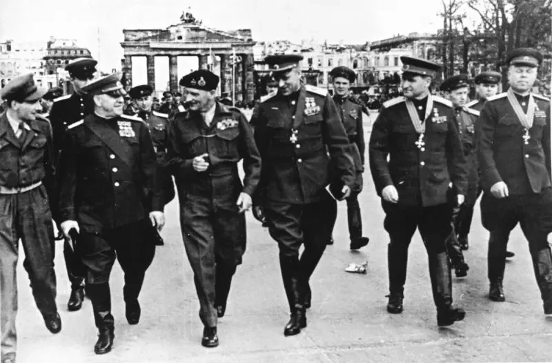 На фото слева направо: Маршал Советского Союза Георгий Константинович Жуков (1896-1974), британский фельдмаршал Бернард Монтгомери (1887-1976), Маршал Советского Союза Константин Константинович Рокоссовский (1896-1968), генерал армии Василий Данилович Соколовский (1897-1968), генерал-полковник Михаил Сергеевич Малинин (1899-1960) идут по улицам Берлина после награждения советских военачальников британскими наградами. Г. К. Жуков — Почетный Рыцарь Большого Креста Ордена Бани, К. К. Рокоссовский — Почетный Рыцарь-командор ордена Бани, В. Д. Соколовский и М. С. Малинин — Кавалер ордена Британской империи (военный). 12 июля 1945