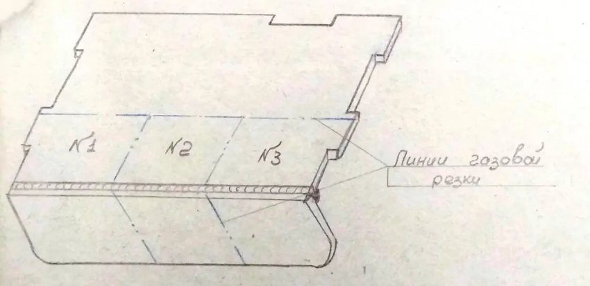 При просвечивании в наружном сварном шве предполагался дефект в виде трещины. При поломке узла "НОС" в месте предполагаемого дефекта при просвечивании выявлен подкол по основному металлу. Для облегчения поломки и получения изломов по сварным швам узел был прерван газовой резкой на три разных участка, которые затем были поломаны под прессом.