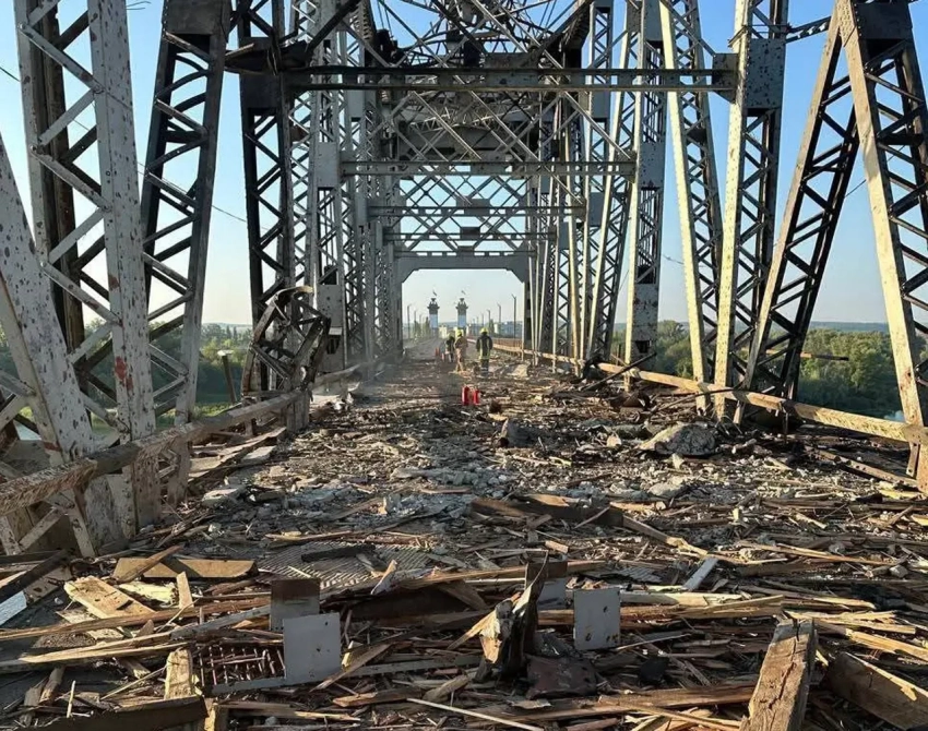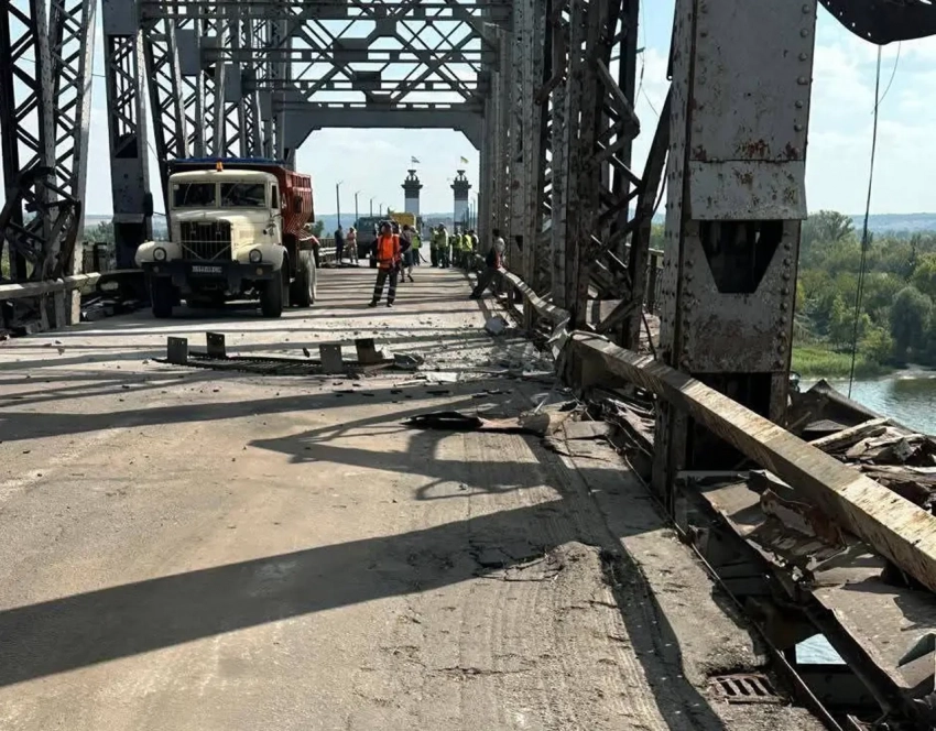 Глава компании-оператора украинских железных дорог публикует новые фото с состоянием Крюковского моста через Днепр в Кременчуге. Напомним, что по мосту было несколько прилётов БПЛА «Герань» в ночь на 7 сентября.