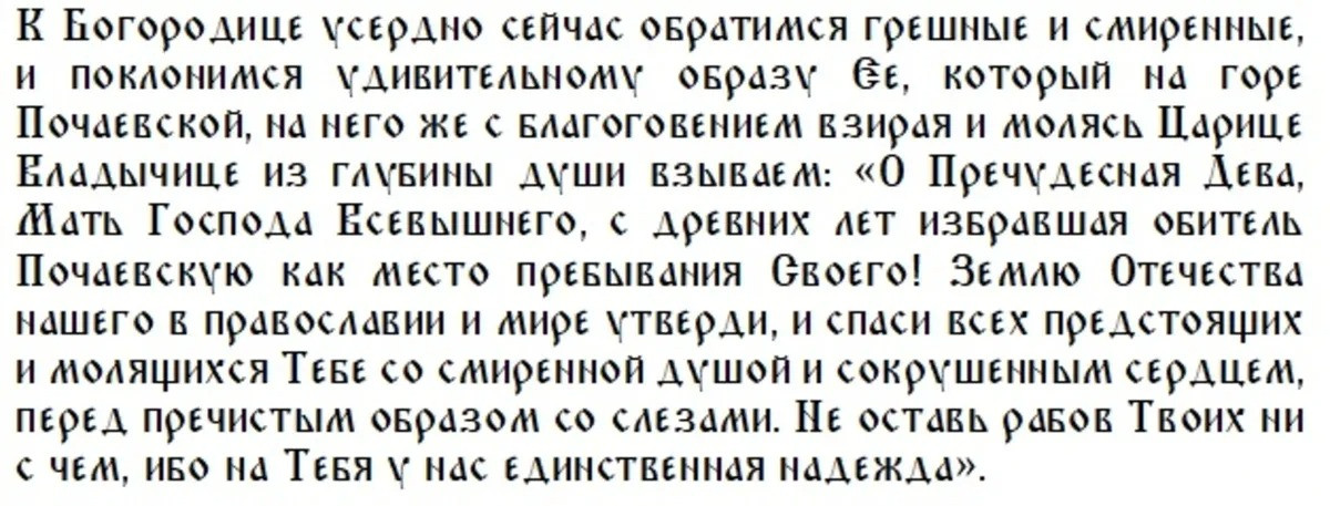 Верующие возносят свои молитвы Почаевской иконе Божией Матери, просив ее об исцелении от болезней тела и души, о даровании покоя и мира в семье, а также когда возникают трудности материального характера.