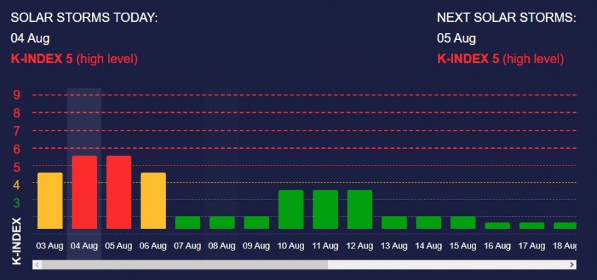 Иностранные площадки также предупреждают о магнитных бурях 5 августа. Так, по данным meteoagent.com, в этот день ожидается активность до K-index 5. Магнитная буря должна ослабнуть до K-index 4 6 августа.