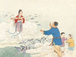 Но однажды ему довелось заметить, как, раздевшись, в озеро вошли сёстры-феи и начали купаться. Нюлан забрал их платья и затаился. Тогда из озера вышла прекрасная молодая девушка по имени Чжинюй (Ткачиха) и стала искать, куда подевались платья.