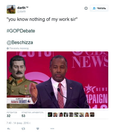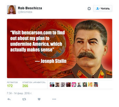 Так что, Бен Карсон, вполне очевидно, цитировал вовсе не Сталина. Причем сделал это не в разгаре «затяжных политических дебатов», когда был вынужден говорить без подготовки, отмечает издание. Это было его заключительное заявление, продуманное и подготовленное. Впрочем, в интернете эта якобы цитата Сталина приобрела популярность, вдохновив пользователей на целую волну шуток. Washington Post приводит некоторые из них: «Зайдите на bencarson.com, чтобы узнать больше о моем плане по уничтожению Америки, который и правда представляется логичным».