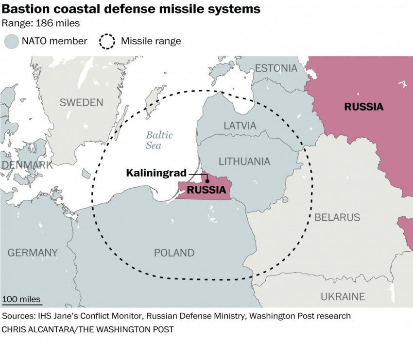 Береговой ракетный комплекс «Бастион». В октябре Россия укрепила противокорабельную оборону Калининграда с помощью этой системы. Кроме того, она использовалась в качестве наступательного оружия против сирийских повстанцев. Радиус действия сверхзвуковых ракет, используемых комплексом, достигает 200 миль и, согласно карте The Washington Post, охватывает территорию Польши, Литвы и Латвии, а также шведских островов Готланд и Эланд. В случае конфликта эти комплексы способны уничтожить корабли НАТО, которые попытаются прийти на помощь Прибалтийским государствам. ЗРК наземного базирования С-400. Россия уже использует эти передовые ракетные системы для защиты своей авиабазы в Сирии. С-400 может одновременно отслеживать и уничтожать несколько воздушных целей в радиусе 250 миль. Комплексы, размещенные в Калининградской области, смогут взять на прицел самолеты и ракеты стран НАТО почти во всем Прибалтийском регионе.
