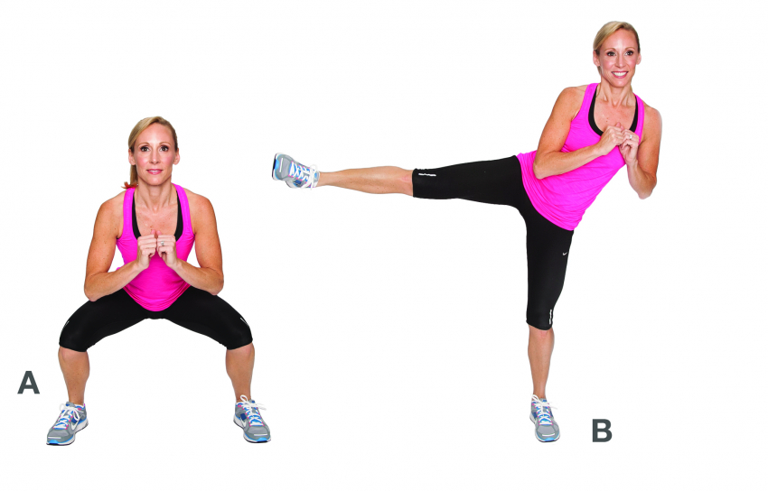 Поставьте ноги на ширине плеч, руки держите согнутыми на уровне груди. Сделайте присед, вернитесь в исходное положение и высоко отведите правую ногу в сторону. Повторите то же самое на левую ногу. При выполнении этого упражнения задействуются ягодицы, ноги и внутренняя поверхность бедер.