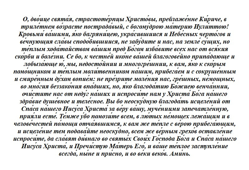 Мученики Кирик и Иулитта, сын и мать, пострадали около 305 г. Они жили Икорнии, городе Лиоканской области Малой Азии. Из-за гонений императора Диоклитиана христианке вместе с ребенком пришлось бросить все имущество и скрываться. Однако, она была узнана и задержана. На суде правителя Александра Иулитта, как и ее малолетний сын, отказались следовать языческим верованиям и были преданы мученической смерти.