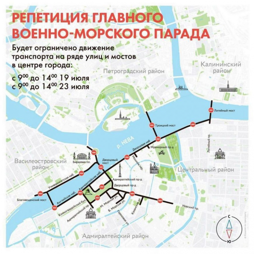 На День Военно-Морского Флота в Санкт-Петербурге будет перекрыта часть улиц. Власти обращаются к водителям с просьбой заранее спланировать свои маршруты в объезд мест празднования, чтобы не создавать дополнительные пробки.