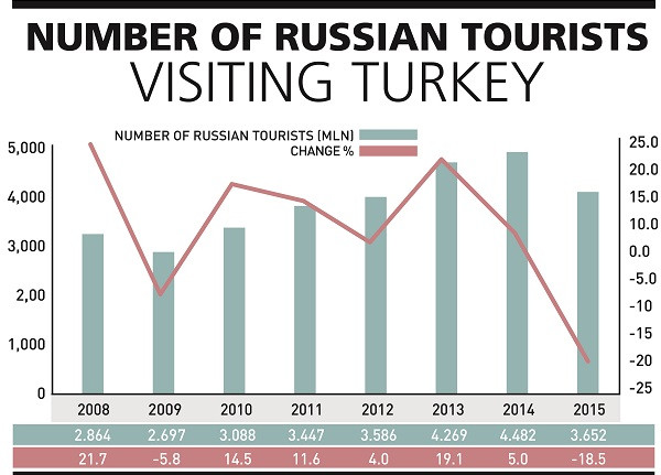 Доля России в ежегодных доходах туристического сектора турецкой экономики была стабильной и в период между 2003 и 2008 гг. незначительно колебалась вокруг отметки в 6 процентов. После кризиса 2008 года она даже выросла, и в 2014 году достигла 8,6 процента. Однако, в 2015 году туристский поток из России упал на 19 процентов, а доходы от российских туристов по предварительным оценкам сократились на 33 процента.