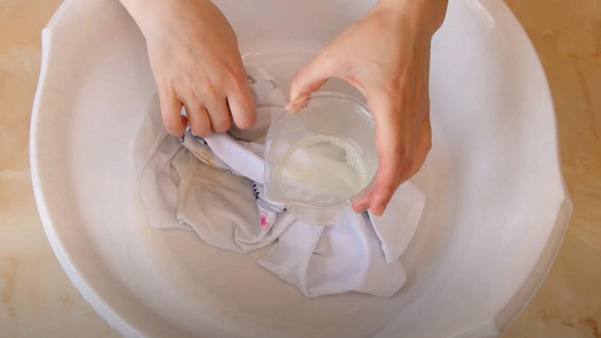 - Растворите уксус и соду в горячей воде, чтобы сделать раствор для замачивания одежды.