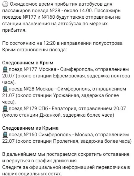 Среди них поезд из Петербурга в Евпаторию, который отправился в Крым 20 июля. Он задержан более чем на час около станции Джанкой.