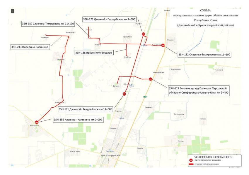 Опубликована схема перекрытых дорог в Джанкойском и Красногвардейском районах