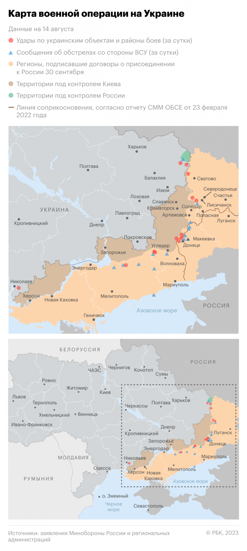 Обновленная карта боевых действий на Украине по данным на утро 15 августа — Минобороны обновило новую карту боевых действий 15.08.2023
