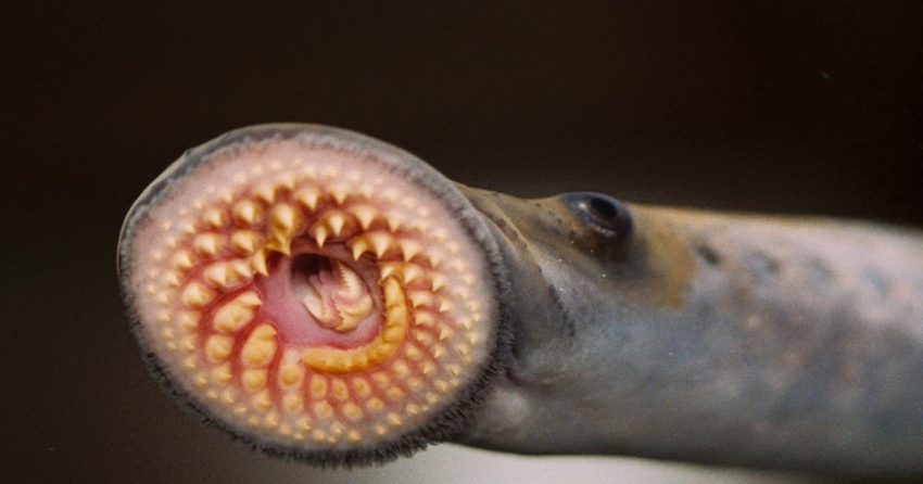 В Америке нашли удивительную морскую миногу (petromyzon marinus), напоминающую угря. Существо присасывается к обитателям озер, питаясь их кровью.