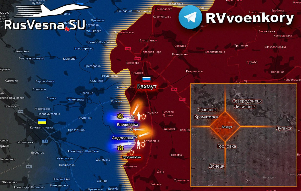 В зоне интенсивных боев, на юге Артемовска (Бахмута), продолжается ожесточенная борьба за контроль над населенными пунктами Клещеевка и Андреевка. Обе стороны понесли значительные потери, а села практически стерты с лица земли.
