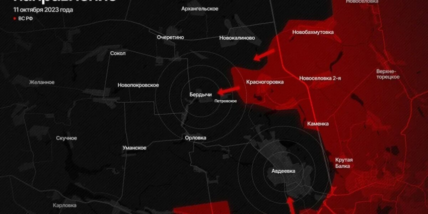 Карта боевых действий за Авдеевку, опубликованная в Telegram-канале «Иди и смотри», показывает, что российские войска уже находятся в непосредственной близости от Авдеевки. Российские войска ведут бои за село Бердичи, которое расположено к северу от Авдеевки. В случае взятия Бердичей российские войска получат возможность войти в тыл к ВСУ, которые обороняются в Авдеевке.