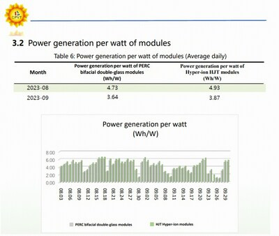 На рис. 2 показаны данные испытаний выработки энергии, проведенных в провинции Хайнань компанией Risen Energy совместно с Национальным центром надзора и инспектирования качества фотоэлектрических солнечных изделий (CPVT). Хотя с момента подключения к энергосистеме прошло всего два месяца, расчеты на основе собранных данных о выработке энергии показывают, что модули HJT Hyper-ion обеспечивают выработку энергии на 5,13 % выше, чем модули PERC. Этот результат близко совпадает с результатами моделирования на рис. 1, которые показывают, что выработка модулями HJT энергии в провинции Хайнань на 5,51 % выше, чем выработка модулями PERC. Это означает, что наше моделирование выработки энергии имеет относительно высокую справочную ценность.